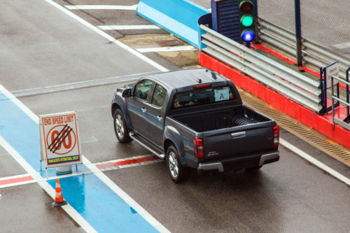La seguridad de un circuito de velocidad era la excusa perfecta para mostrar los niveles de seguridad de la D-Max, en una curiosa prueba en la que los monitores, en lugar de advertirte “cuidado con esa curva” o “en esta entra más despacio”, lo que te decían era “entra más fuerte”… y así lo hicimos.