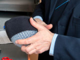 7º A continuación se le aplica un casquete de la medida interior del corcho blanco y al mismo tiempo un aro compresor, con el fin de que el usuario presione sobre sí mismo, para que cuando el molde se haya quedado frio quede lo más exacto a su cabeza.