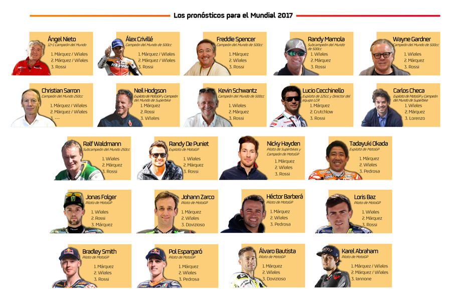 Ante esta situación, 22 pilotos y ex-pilotos han sido preguntados sobre sus apuestas de cara a esta próxima temporada y quienes piensan que serán los tres primeros al final de temporada. Destaca el duelo Marquez-Viñales, como también lo hace la ausencia del nombre de Lorenzo.