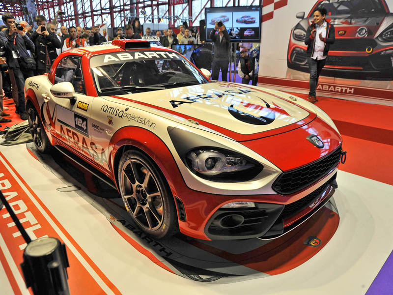 Muy cerca, en el stand de Abarth, la marca italiana del escorpión presentaba su Abarth 124 Rally, modelo desarrollado a partir del Abarth 124 spider. Un biplaza con motor delantero-central longitudinal y tracción trasera, con una cilindrada de 1,8 litros de gasolina, turbo, caja de cambios SADEV, diferencial autoblocante, y con algo más de 300 caballos de potencia.