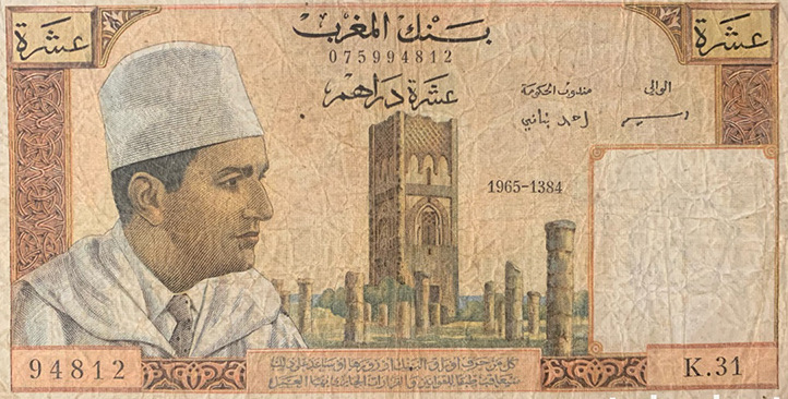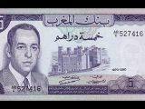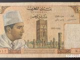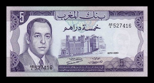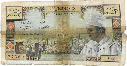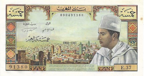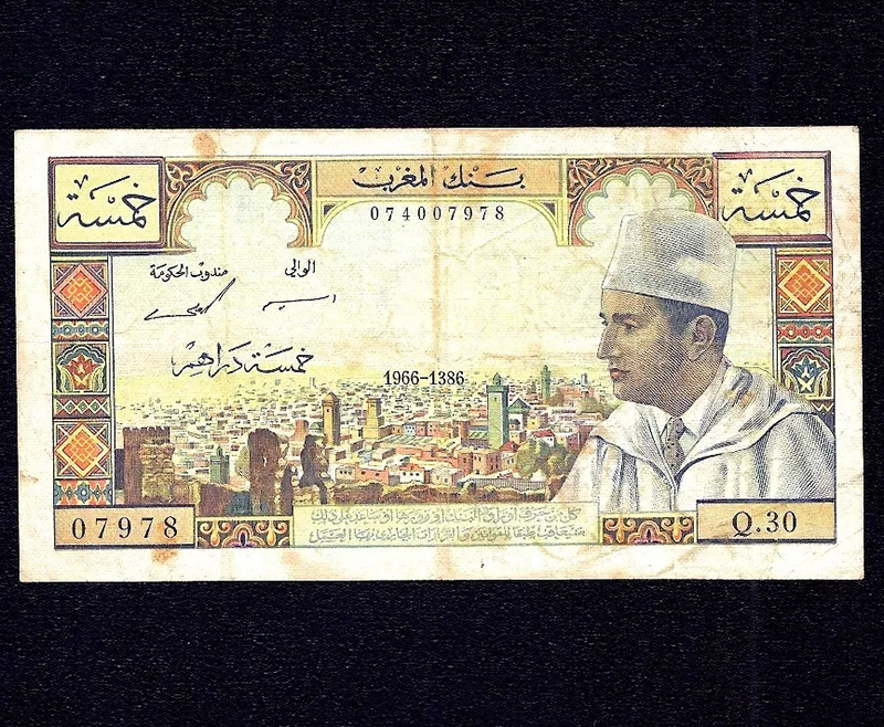 P53 5 dh. de 1960. Primer billete emitido por Marruecos tras su independencia, en la que se puede ver el retrato de un joven Mohammed V. Impreso aún por el Banco de Francia. El de la foto, es un P53d, denominación que corresponde a las series emitidas en 1966.