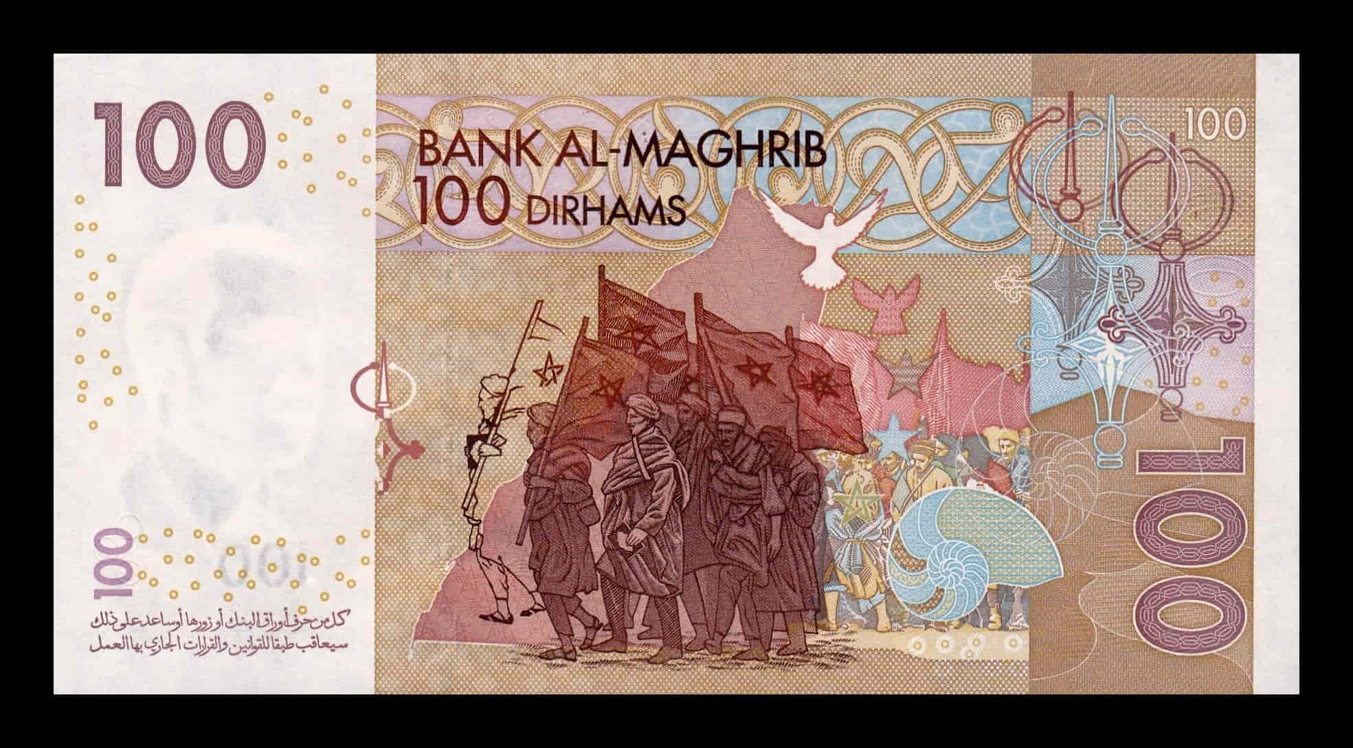 100 Dirhams: Arquitectura e historia, o eventos nacionales importantes (ej. Moussem de Tan-Tan, diversidad cultural). También se ha lanzado una nueva versión en noviembre de 2023.