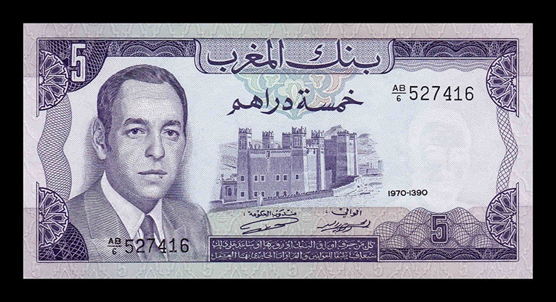 Primeras Series del Dirham (décadas de 1960-1980): Los primeros billetes del dirham presentaban retratos de los monarcas Mohammed V y Hassan II, junto con representaciones de la rica herencia cultural, arquitectónica y natural de Marruecos.