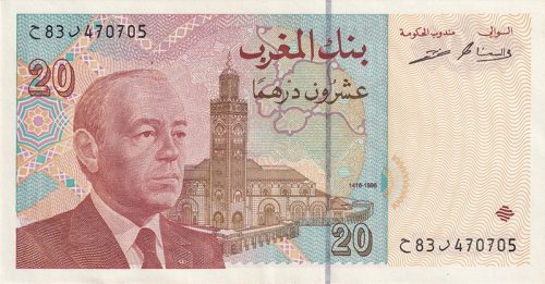 P62 de la serie 1987-1. Esta serie estuvo muy poco tiempo en circulación y fue sustituida por la 1987-2, en la que los billetes mantenían exactamente el mismo diseño pero cambiaba el retrato de Hassan II, mirando al frente en la serie I y mirando hacia la izquierda en la serie II. Primeros billetes impresos por Dar As-Sikkah.