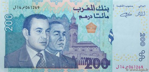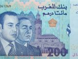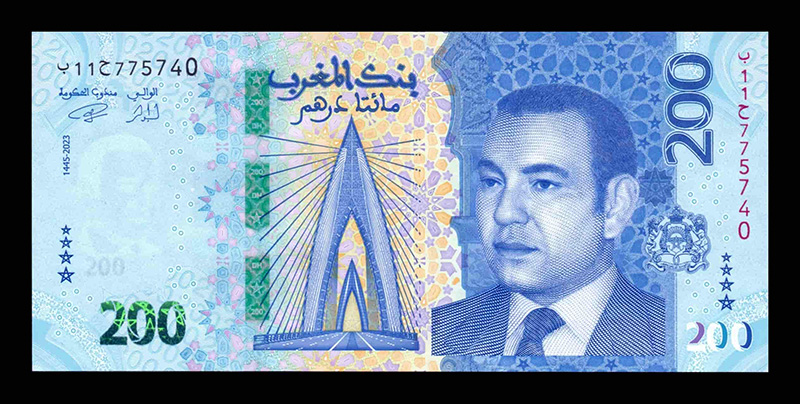 200 Dirhams: Desarrollo económico, grandes proyectos y el mar (ej. Puerto de Tánger, energías renovables). El billete de 200 dirhams también fue rediseñado en enero de 2024, destacando la Torre Mohammed VI y el Aeropuerto Internacional Marrakech-Menara.