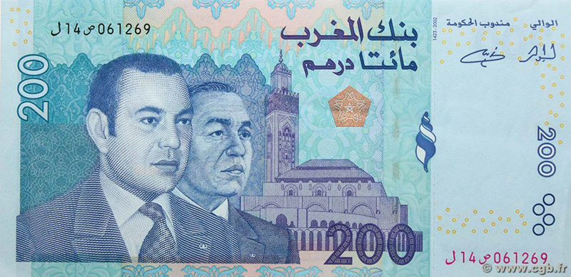 Series de Principios del Siglo XXI (ej. Serie 2002-2005): Estas series introdujeron mayores medidas de seguridad y comenzaron a modernizar los diseños, aunque aún con el retrato de los reyes Hassan II y Mohammed V en algunos billetes y ya con Mohammed VI en todos ellos.