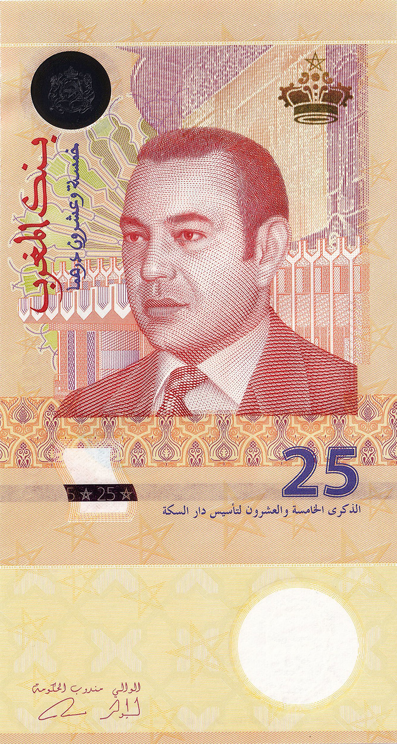Un hito importante en la historia monetaria de Marruecos fue la inauguración de Dar As-Sikkah el 5 de marzo de 1987 por el Rey Hassan II. Esta es la Casa de la Moneda marroquí, lo que permitió a Bank Al-Maghrib tener su propia instalación para la fabricación de billetes y monedas, uniéndose así al prestigioso grupo de bancos centrales con capacidad de producción propia. Para celebrar su 25 aniversario, la casa de la moneda marroquí emitió un billete de 25 dh, vertical y de composición híbrida, primer billete del mundo impreso en Durasafe (un sustrato de polímero entre dos capas de papel).