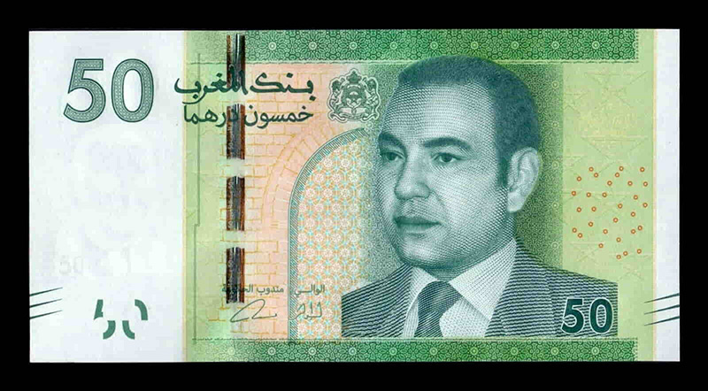 50 Dirhams: Cultura y naturaleza (ej. Oasis, desierto, patrimonio). En 2024 se emitió un nuevo billete de 50 dirhams conmemorativo del 25 aniversario del reinado de Mohammed VI, destacando el desarrollo sostenible.