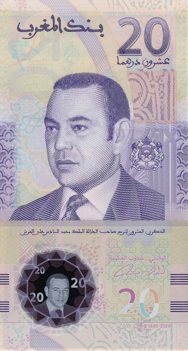 Igualmente con motivo de la celebración del 20º aniversario de la entronización del Rey Mohammed VI, el Banco Al-Maghrib emitió un billete conmemorativo de 20 dirhams. Este billete, diseñado y producido por Dar As-Sikkah, está impreso totalmente en polímero y se distingue por la orientación vertical de su anverso compuesto por el retrato de Su Majestad el Rey Mohammed VI. El reverso del billete está formado por representaciones estilizadas de algunos de los principales proyectos realizados durante el reinado del actual rey. Encontramos el Puente “Mohammed VI”, la central solar “NOOR 3”; el Satélite “Mohammed VI” o la línea de alta velocidad “Al Boraq”. Realizaciones que presentan las diferentes facetas de un Marruecos moderno y comprometido con el camino del progreso.