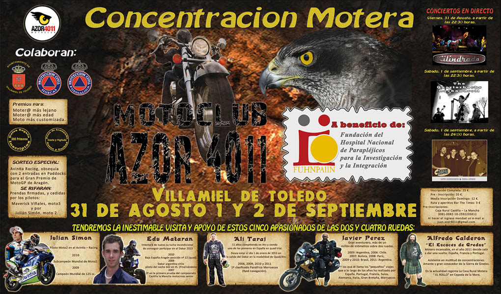 La solidaridad motera con la lesión medular y la Fundación del Hospital Nacional de Parapléjicos para la Investigación y la Integración (FUHNPAIIN), se hace de nuevo realidad con la concentración motera que tendrá lugar en Villamiel, el fin de semana del 31 de agosto al 2 de septiembre, por iniciativa del moto club Azor 4011.