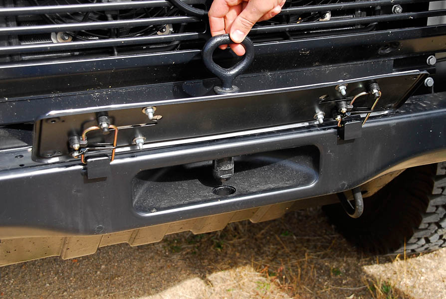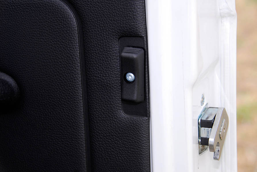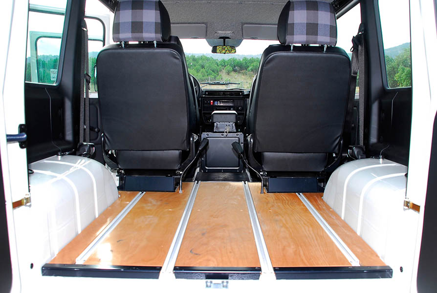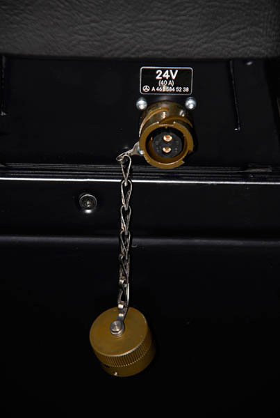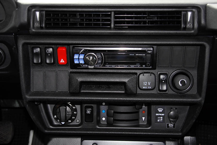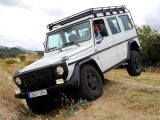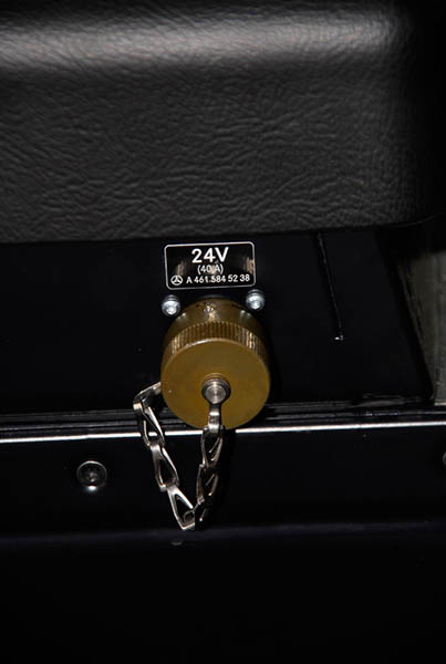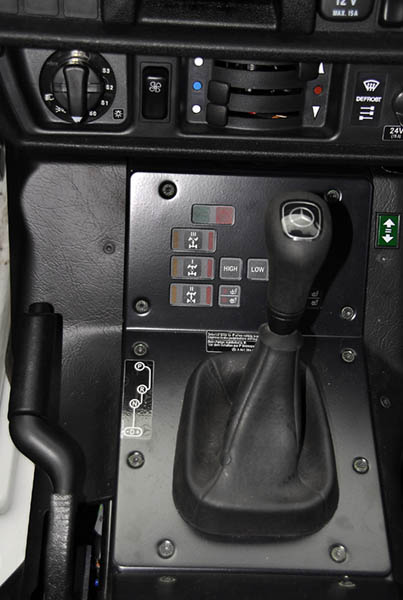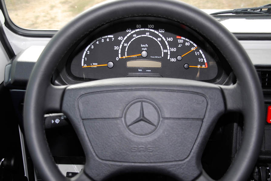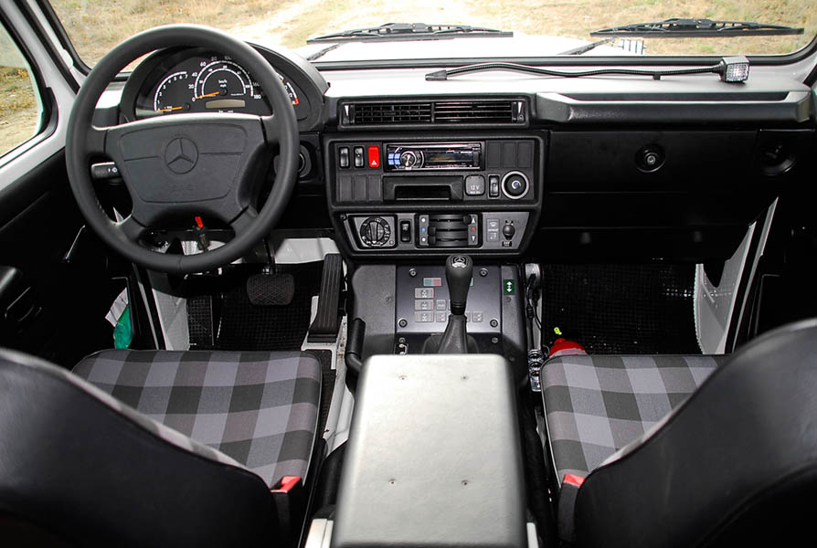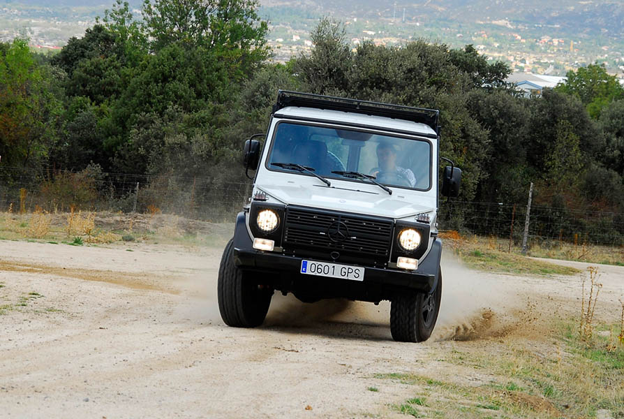 Esta primera mala sensación desaparece en el momento de cerrar la puerta y escuchar el ruido que produce, potente, seco, exactamente el mismo que seguían produciendo las otras dos unidades antiguas de las que dispusimos y que es como una declaración de intenciones de una carrocería que te avisa de cuanto tiempo está dispuesta a perdurar. La posición de conducción es la típica de un G, situándose el conductor bastante alto, lo que le permite tener una buena perspectiva de lo que le rodea y con los mandos situados de forma razonable, llaman la atención los pulsadores de los bloqueos, que provenientes del Unimog como ya hemos dicho, estarán totalmente probados pero que, a algunos, especialmente en este coche, nos hubiese gustado más disponer de los antiguos tiradores. En el cuadro también podemos ver dos tomas de corriente, una de 12V y otra de 24V, y es que este modelo viene equipado con 3 baterías, dos para el arranque (a 24 V) situadas en el vano del motor y otra para el resto de servicios situada en el interior del vehículo, tras el apoyabrazos de las plazas delanteras vemos otra toma de corriente de 24 V y 40 A de origen claramente militar. Los botones de los espejos electricos (una opción menos interesante que otras de las que carece) son lo último que nos llama la atención antes de ponernos en marcha.