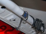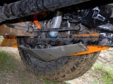 Faldillas en ruedas delanteras, traseras y central, esta última a continuación del chapón que cubre el carter, el cambio y la transfer, en la misma línea de protección, la suspensión trasera va protegida con piezas plásticas y metálicas. La T del latiguillo de freno también ha sido protegida para resguardarla de los golpes más directos. Siguiendo por debajo, podemos ver los dos amortiguadores por rueda, que como nos explicaba Alberto, en este momento eran un Ohlins y un King por cada una de ellas, también los limitadores de extensión. Lo que no se puede apreciar son el sinnúmero de refuerzos que se le han añadido a lo largo de todo el chasis.