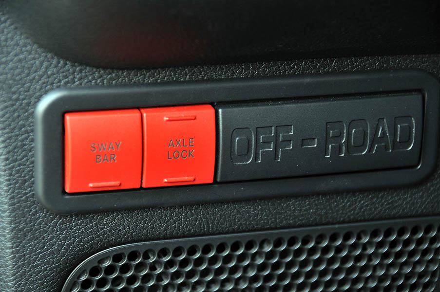 Al engranar la reductora (la misma palanca, más lagrimones), nos quedamos con un desarrollo tan corto y con tanta potencia a nuestra disposición que tenemos la sensación de que no va a haber obstáculo insuperable, y efectivamente, como acostumbra a suceder con los coches de trial extremo, el límite lo marcan los neumáticos. Ahora sí, al engranar las cortas, en el cuadro nos indica que se ha desconectado el control de tracción y el de estabilidad.