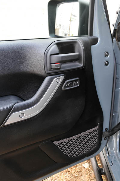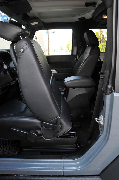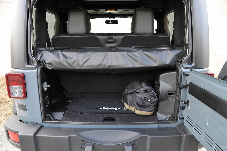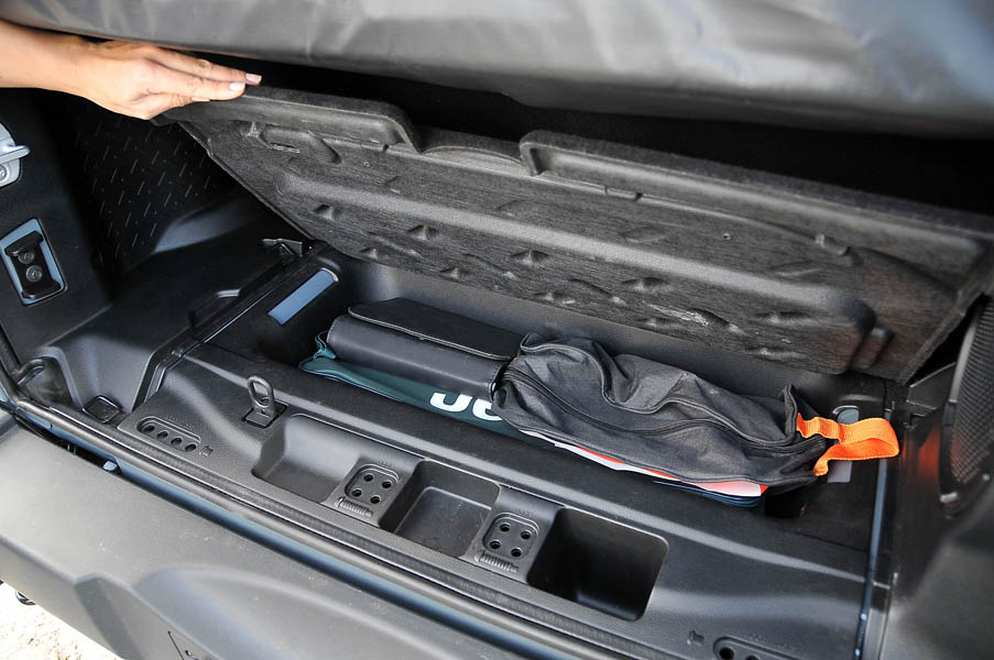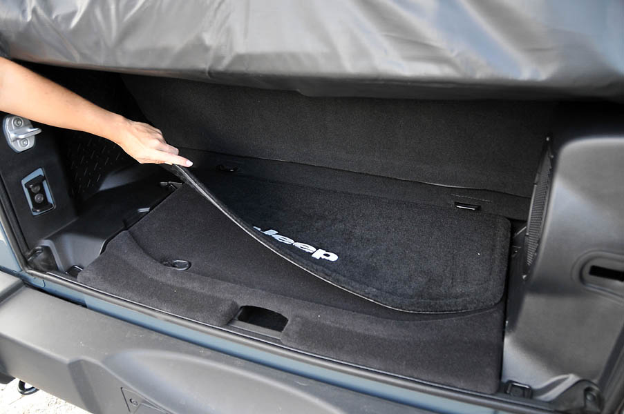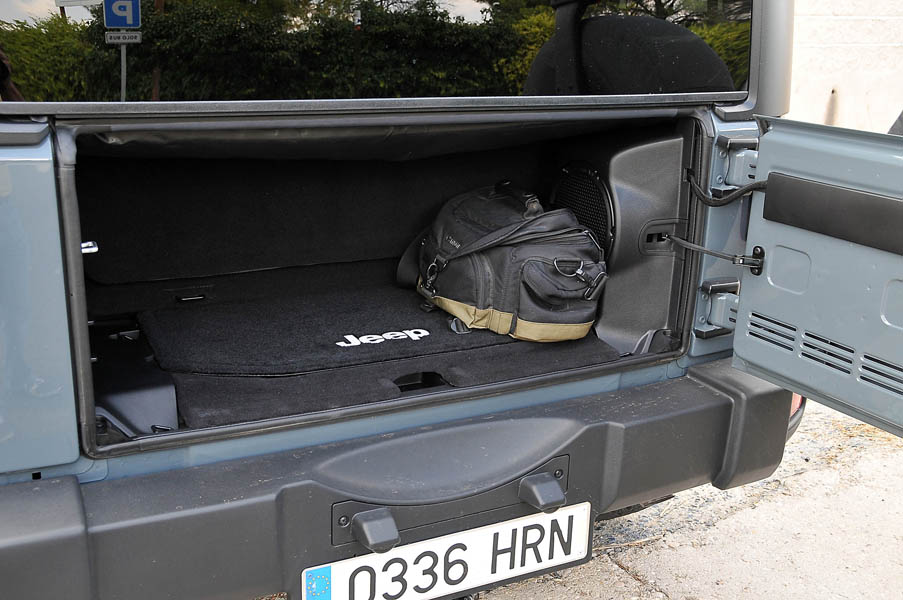Como en los antiguos Wrangler, en este también se pueden desmontar las puertas, abatirse la luna delantera, desmontar el techo rígido y colocar, en su lugar, una capota blanda que va situada en una bolsa en la mini bandeja trasera…