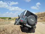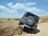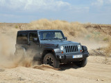 En mi tradicional circuito primero me dirigí a la zona de río de arena, que en el caso del Rubicón se quedó en una simple pista “manchada” de arena. Con las ruedas a 2,8 Kg. de presión (para carretera), no hace falta ni meter la tracción cuatro para arrancar; su altura, los neumáticos y una suave entrega de potencia siendo comedidos con el acelerador, consiguen que lo poco que se quiere hundir al comenzar a traccionar las ruedas traseras no suponga el más mínimo problema.