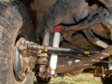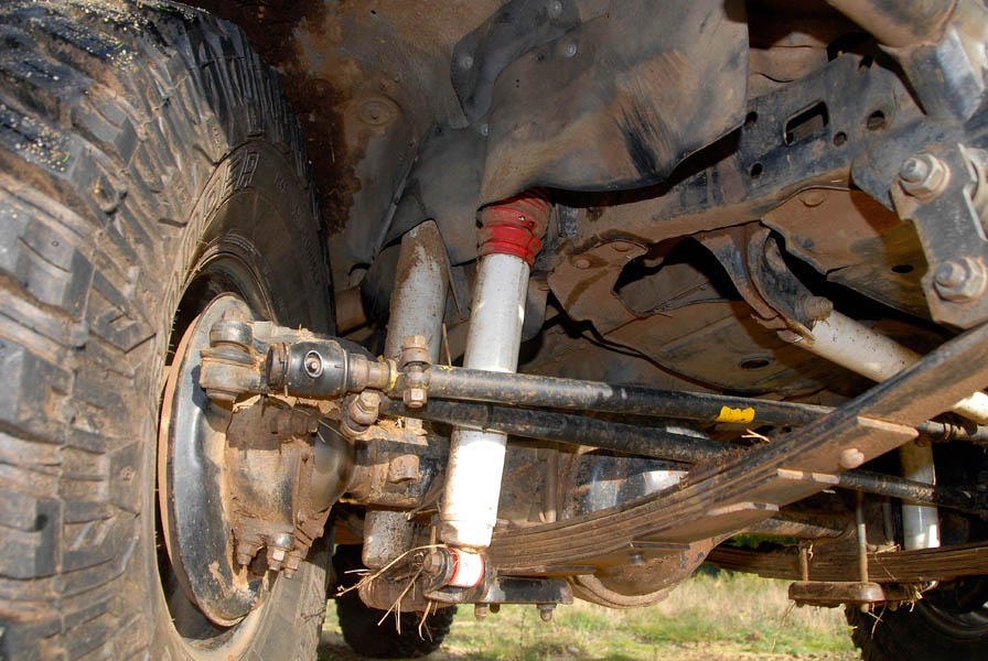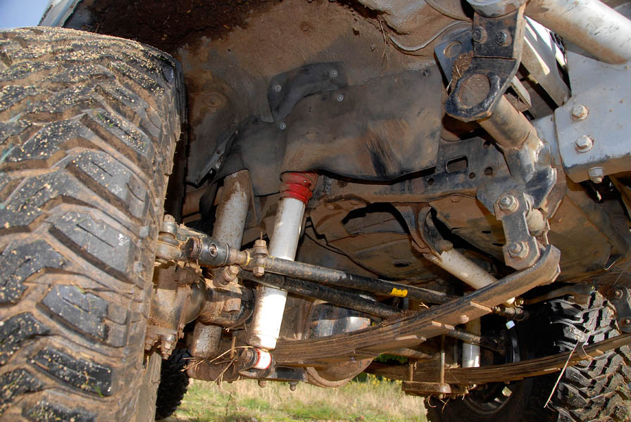 Al asomarnos a los bajos vemos que está dotado de un sistema de doble amortiguación, por una parte 4 amortiguadores Rancho 9000 con centralita, para poder regularlos desde el habitáculo, y por otra, otros 4 amortiguadores Trail Master, todo ello acompañado de unas ballestas reforzadas Old Man Emu. Siguiendo por el “sótano”, también podremos ver los tubos del bloqueo ARB en el grupo trasero.