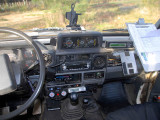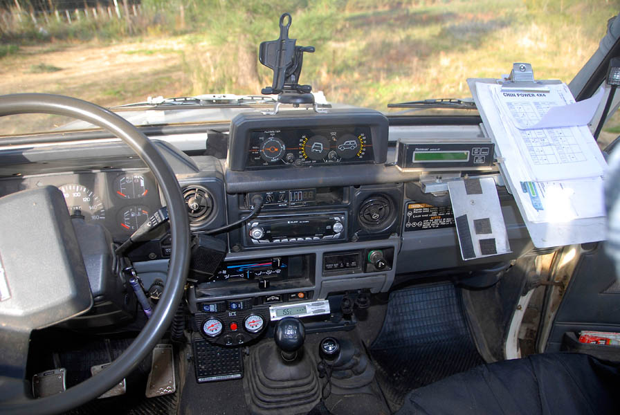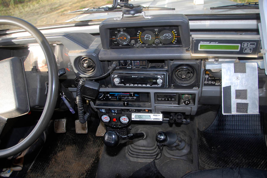 En el interior todo está organizado para la realización de grandes rutas, y así, además del altímetro-inclinómetro original del coche, podemos ver un terratrip, la emisora de 27 Mhz. con altavoz externo, soportes para rutómetros y toma de notas, luz de lectura de mapas, reloj con temperatura exterior, tomas múltiples de corriente, los botones del compresor y el bloqueo ARB, los manómetros de los amortiguadores Rancho así como los soportes para los dos GPS que Tonecho siempre acostumbra a llevar en las rutas.