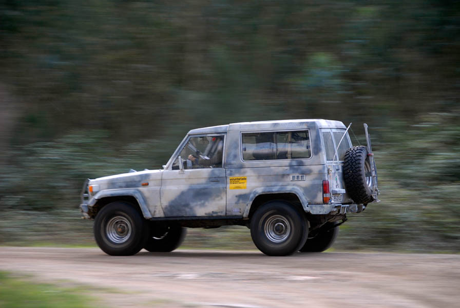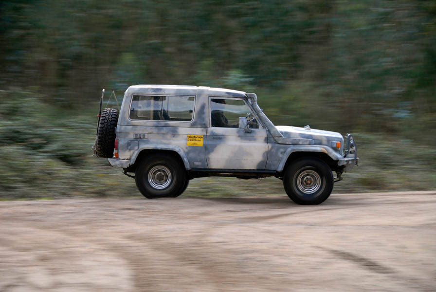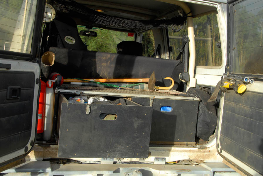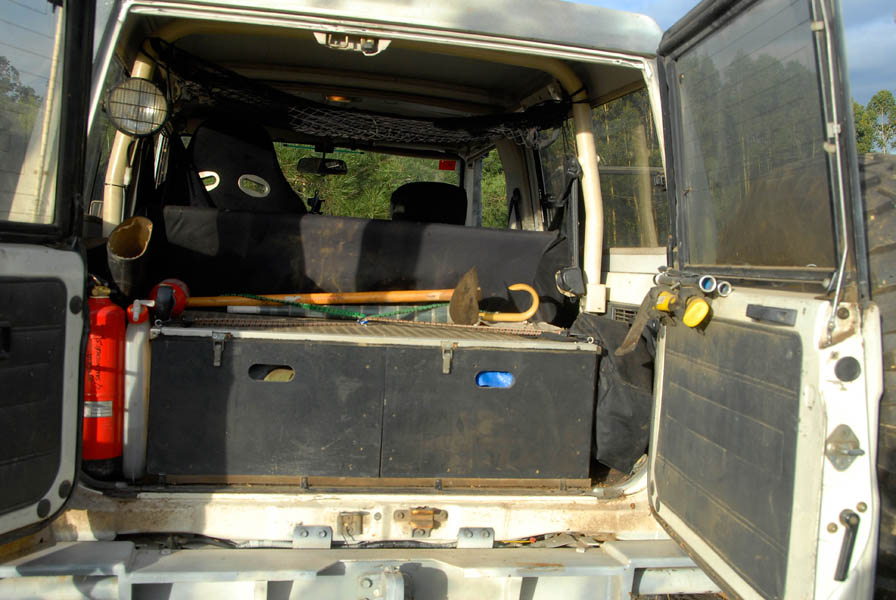 Ya en la parte de atrás del habitáculo, vemos en el maletero unas cajoneras en las que llevar los implementos y herramienta; faro de trabajo, extintor, soportes para el hacha, la pala, azadón (más práctico que la pala con barro y piedras), etc.
