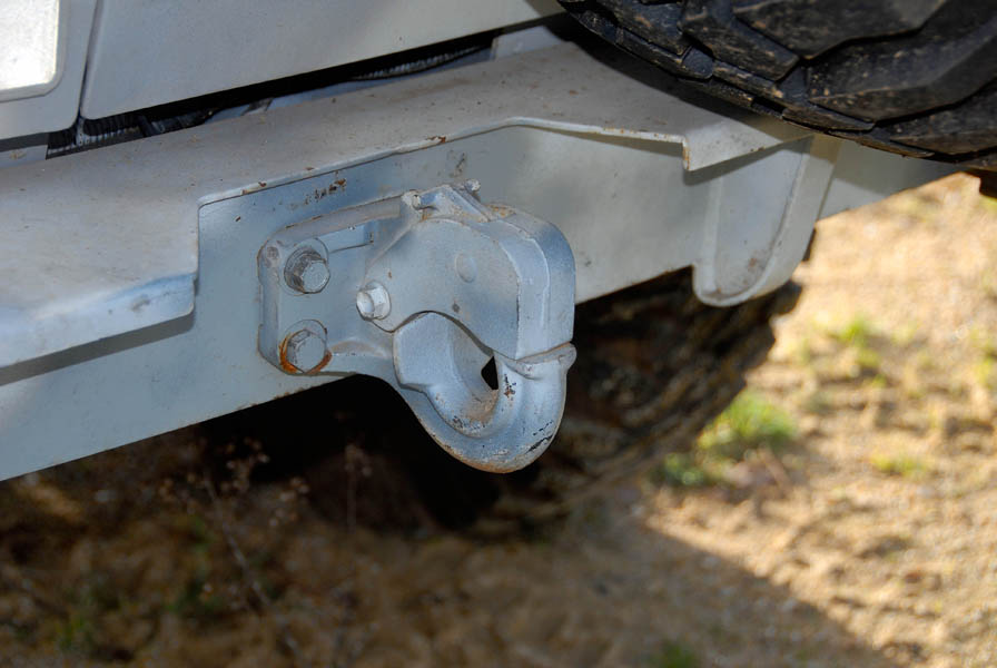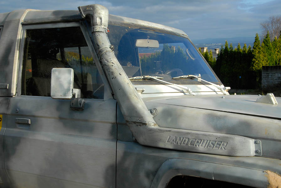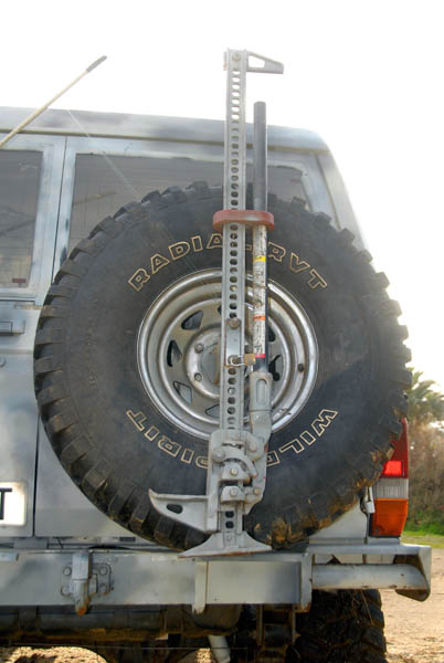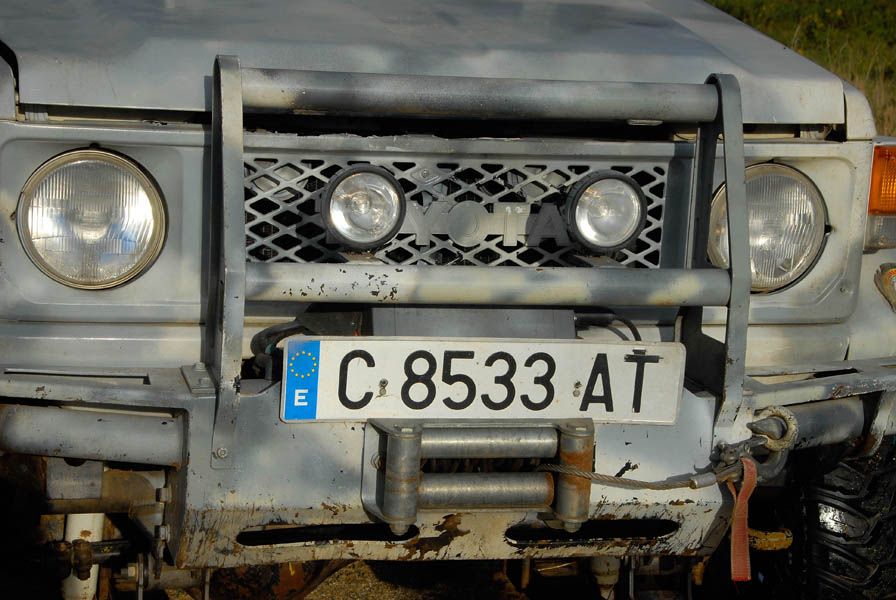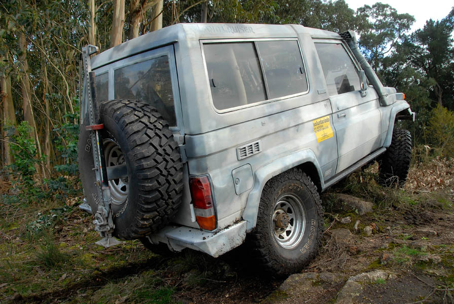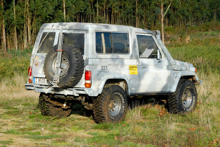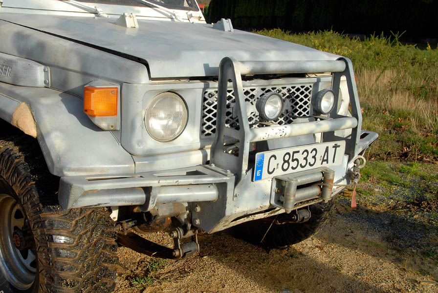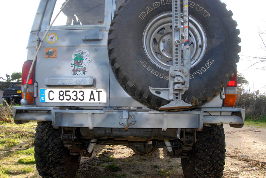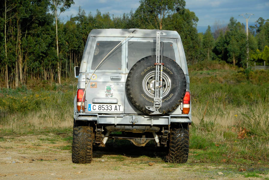 Siguiendo con el exterior, en la defensa delantera se instalo un winch Warm de 9000 Lb. y en la defensa trasera se instalo un gancho militar; para garantizar que el coche siempre respirara aire en la húmeda Galicia, se le colocó un snorkel original Toyota, también vemos un soporte para el gato Hi Lift en la rueda de repuesto.