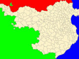 Situación de Llivia (en verde) rodeado de territorio francés (en rojo) en crudo el resto de la provincia de Gerona y también en verde el resto del territorio español.