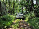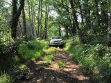 Tras cruzar el puente giramos, maniobrando a la derecha y nos sumergimos en una casi desaparecida pista, muy estrecha, de profusa vegetación y con algún pequeño pero pedregoso vadeo que implica engranar la reductora para hacer las cosas lo más despacio posible y, bajarse del coche, para indicar a nuestro experimentado piloto (Carlos Mariñas, de Noemborques Rutas), la forma de pasar sin enganchar los bajos con alguna puntiaguda piedra.